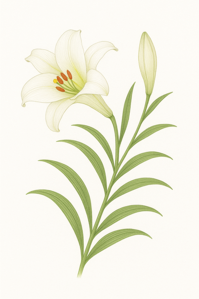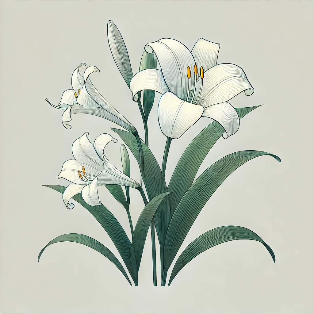 季節の花だよりv 【テッポウユリ(鉄砲百合/Lilium longiflorum)】 【タイトル】純白の清らかな花:テッポウユリ【ディスクリプション】テッポウユリは、真っ白で細長いラッパ状の花が特徴のユリ。純潔や高貴さを象徴し、日本では初夏から夏にかけて咲く... -